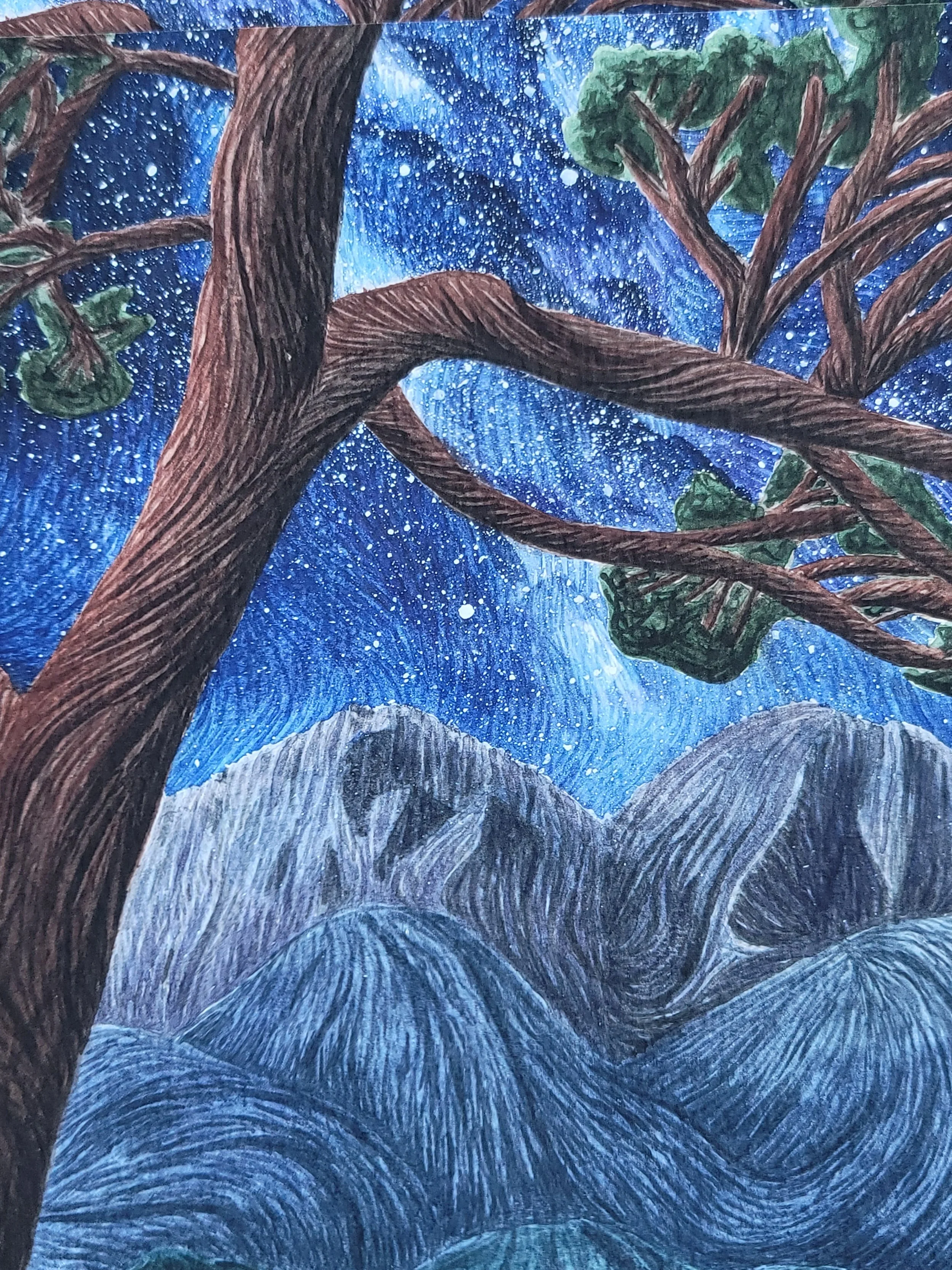 Meaning: This was painted as a rememberance of relatives who loved Rocky Mountain National Park that are no longer living. They now dance eternally amongst the stars. The central mountain is Longs Peak in Colorado.